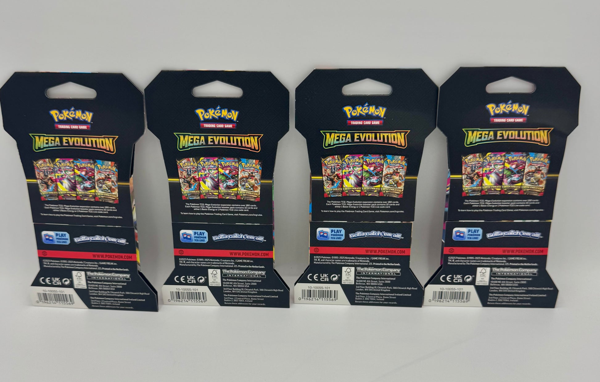 - Produkt: Pokémon Mega Evolution ME01 Booster Sleeved ENG – 4 Pack (alle Artworks)